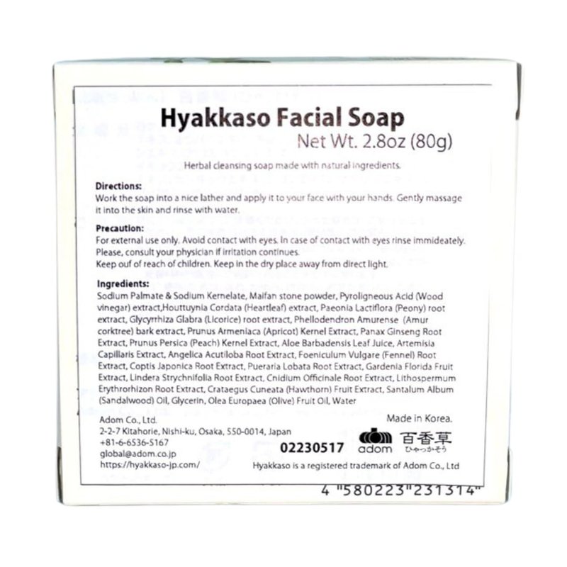- 【SOAP】does not contain any harmful ingredients, preservatives, dyes or added fragrances. Hyakkaso Facial soap is safe for children use. Can be used not only for the face care, but for the body and back acne treatment as well. Hyakkaso Soap helps to preserve the hydration level of skin while getting rid of the impurities. Can be used as a make-up remover, face wash and foam face pack. Prestigious product gained trust in Japan! Over 1,500,000 products have been sold within Japan. ※Made in Korea.