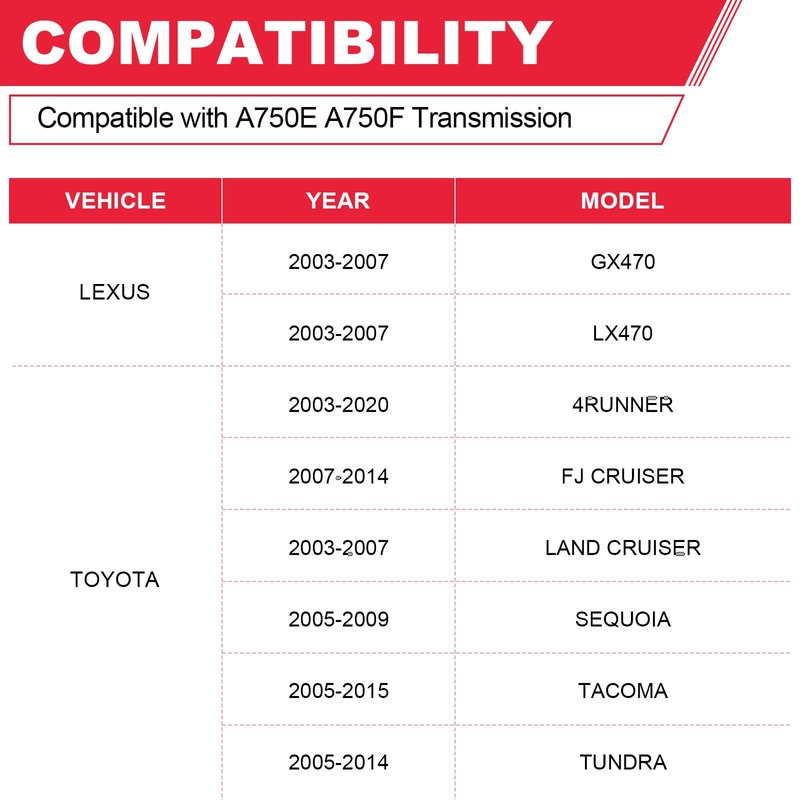 - 【Compatible】Compatible with A750E A750F Transmission.Fit for LEXUS Vehicles:2003-2007 GX470; 2003-2007 LX470.Fit for TOYOTA Vehicles:2003-2020 4RUNNER; 2007-2014 FJ CRUISER; 2003-2007 LAND CRUISER; 2005-2009 SEQUOIA; 2005-2015 TACOMA; 2005-2014 TUNDRA.