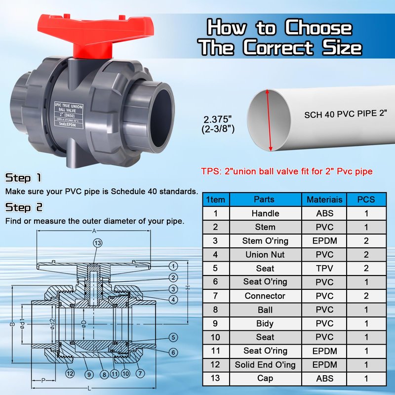 - UPVC MATERIAL: Double ball valve has a PVC body that weighs less than valves made from metals, saving cost and accelerating the project for the easy installation. and it has EPDM O-rings for good resistance to weathering, ozone, UV, electricity, oils, water, steam, and some solvents. The PTFE seat resists chemicals, moisture, and high temperatures.