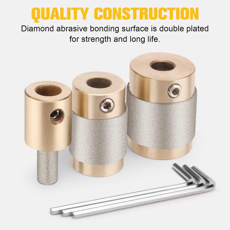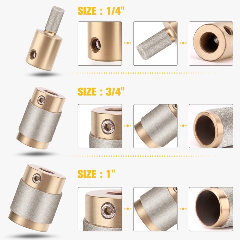 - The drill bit is chrome-plated and hardened have 3 pieces of diamond grinding bits in 3 sizes, namely, 1 inch, 3/4 inch, 1/4 inch, along with 3 matching allen wrenches, different sizes and complete combination to fully meet your DIY use