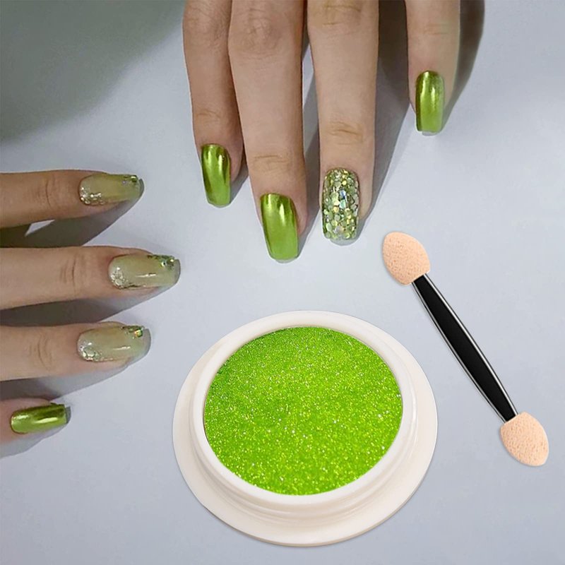 - 【Package Contents】1 Jars spring green powder state chrome nail magic mirror powder with 1 sponge eyeshadow sticks. Holographic chrome nail pigments with a smooth, grain-free texture to create unique nail art for you.