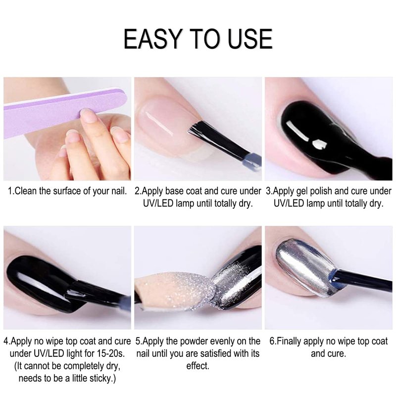 - 【Easy To Use】First keep your nails clean, second apply any base color nail polish you like, then apply non wipe top coat, apply the nail glitter powder while the non wipe top coat is not completely dry. Caution, not too dry, otherwise it will lose the stickiness of the adsorption powder, preferably slightly tacky. Finally apply non wipe top coat and cure. (Warm tips: Different base colors will produce different holo effects.)