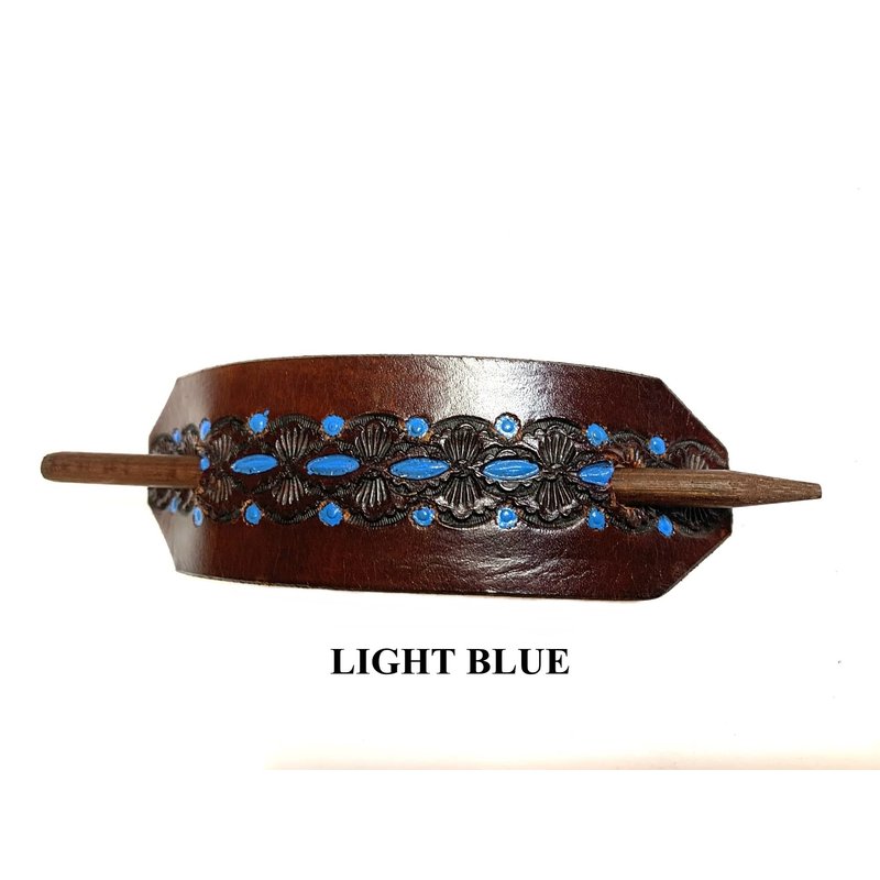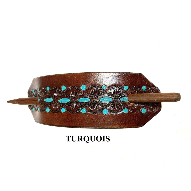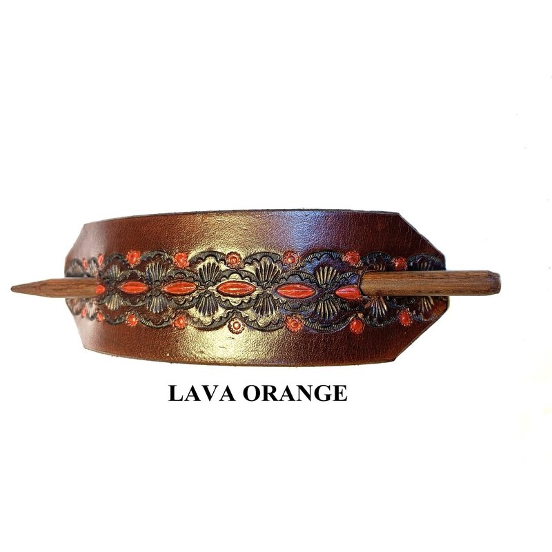 1 LEATHER HAIR BARRETTE…. CLIPPED CORNER DESIGN PONYTAIL HOLDER….. HANDTOOLED HAIR CLIP….. CHOICE OF 4 COLORS - MAHOGANY BACKGROUND #2114