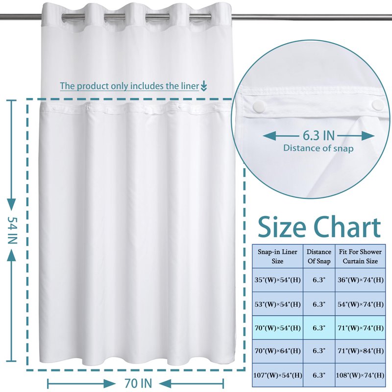 - 100% High Quality& ECO Fabric : Made from premium polyester, Anti-wrinkle, Heat-resistant, this Snap-in shower curtain liner is water repellent, eco material for a healthier bathroom environment for you, kids and your entire family.