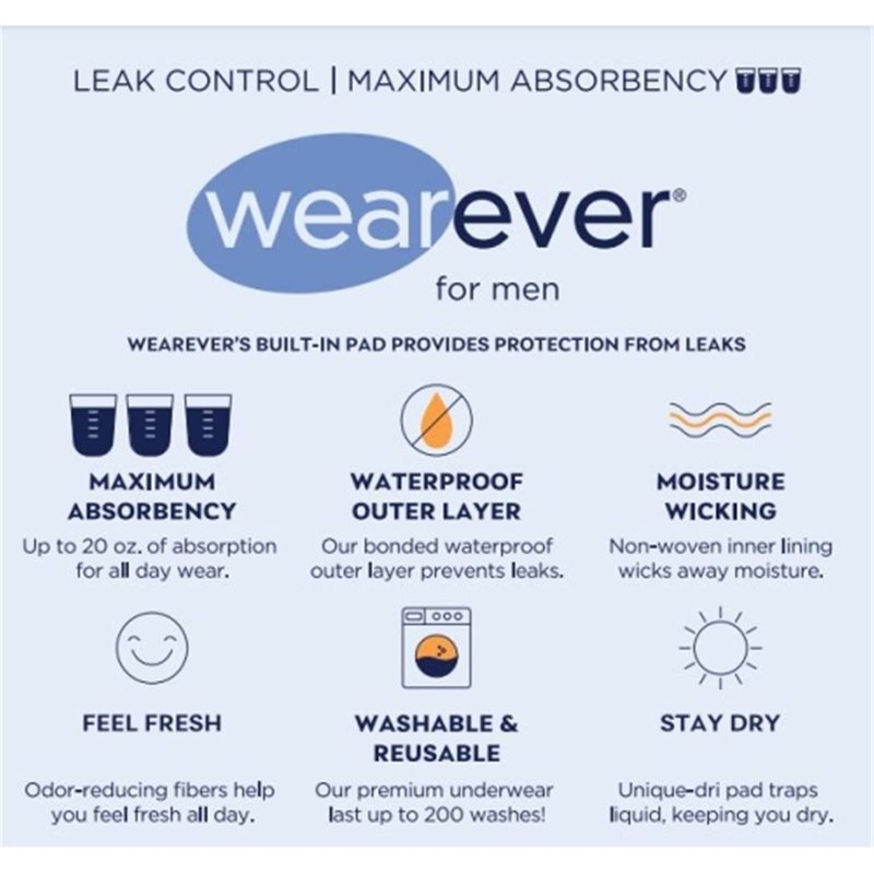 Wearever Men's Maximum Incontinence Panties offer even more protection than our already reliable panties. With the same comfort, style and reusability the Wearever brand has always delivered, reusable incontinence underwear are both an economical and reliable alternative to disposable incontinence products. Our Maximum Incontinence Briefs offer more protection than our regular Men's Super Incontinence Briefs and are soft cotton/poly jersey with odor reducing fibers. This pair of incontinence briefs has a waterproof outer layer, which prevents leakage and provides you with double the protection. Wearever's extra absorbent, sewn-in pad, traps liquid and provides all-day protection. Our incontinence briefs require no extra inserts or disposable pads and offer twice as much absorption as our Wearever Brief MHD100. These Maximum Incontinence Briefs are machine washable and last up to 250 washes!