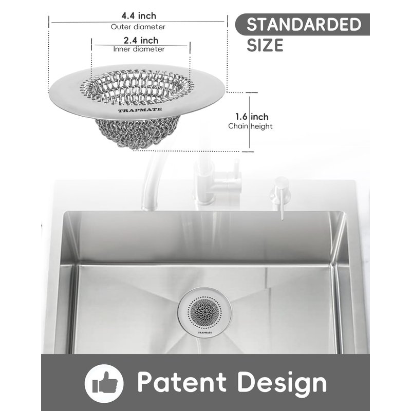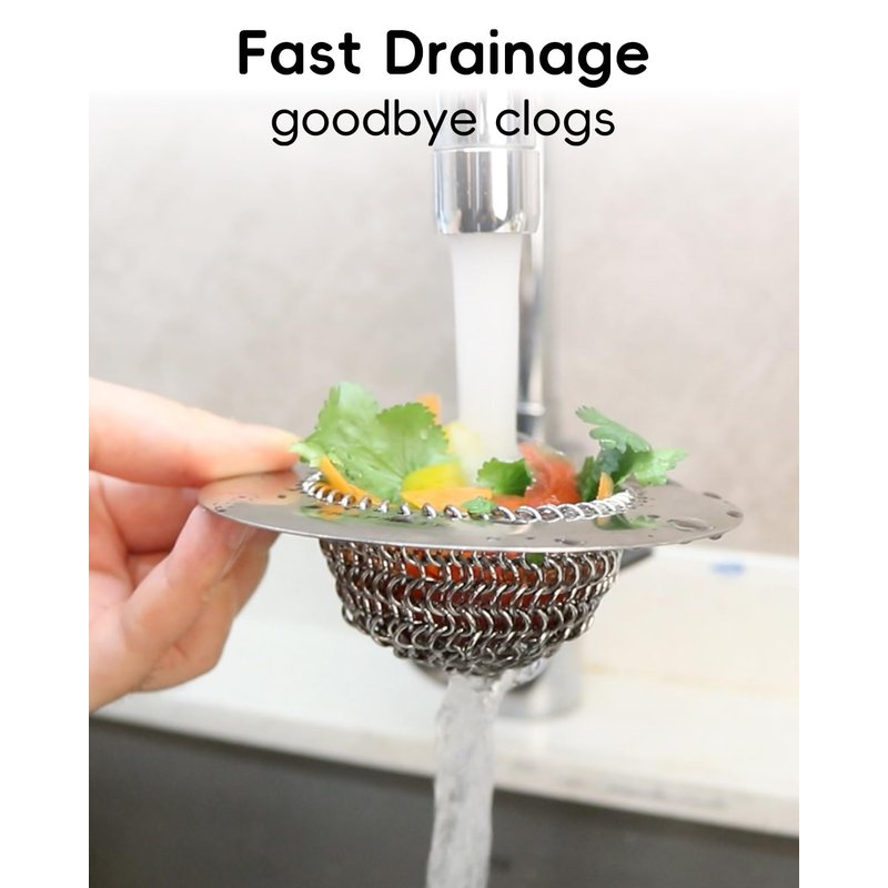 - Revolutionary design: Easy to use and high efficiency is the feature of this mesh sink strainer for kitchen. Sophisticated look chain mesh patented design makes your daily sink cleaning easier. This sink screen strainer can grab the garbage without clogging, and it can be cleaned by flipping it over