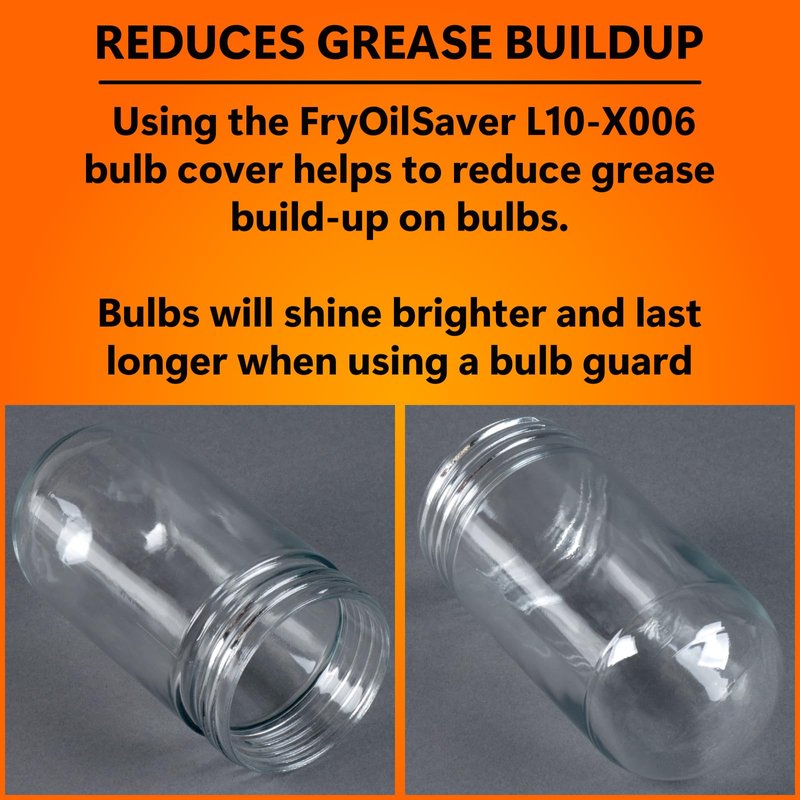 - CLEARER & LONGER-LASTING - Ensure your bulbs shine their brightest with the FryOilSaver L10-X006 bulb cover—a simple solution designed to reduce grease buildup effectively. It improves brightness and clarity, enhancing the overall quality of your lighting. The L10-X006 acts as a protective shield, ensuring your bulbs enjoy a longer and healthier life. The L10-X006 minimizes grease buildup, making maintenance a breeze and keeping your lights consistently clear.