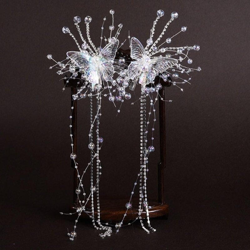1 Pair Butterfly Hair Clip,Bride Wedding Crystal Hair Vine, Rhinestone Bridal Headpiece Tassel Hair Vine,Pearl Bridal Headband for Women and Girls