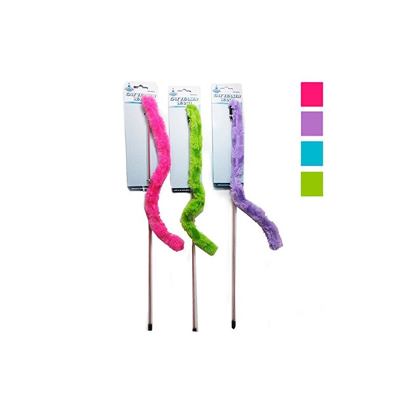 With a sturdy wand, a bell, and very colorful plush fabric, this 20" long toy provides excellent aerobic activity. It is a safe interactive toy for kittens and cats of all ages! Now with a fun selection of colors: light blue, light green, pink, and light purple.