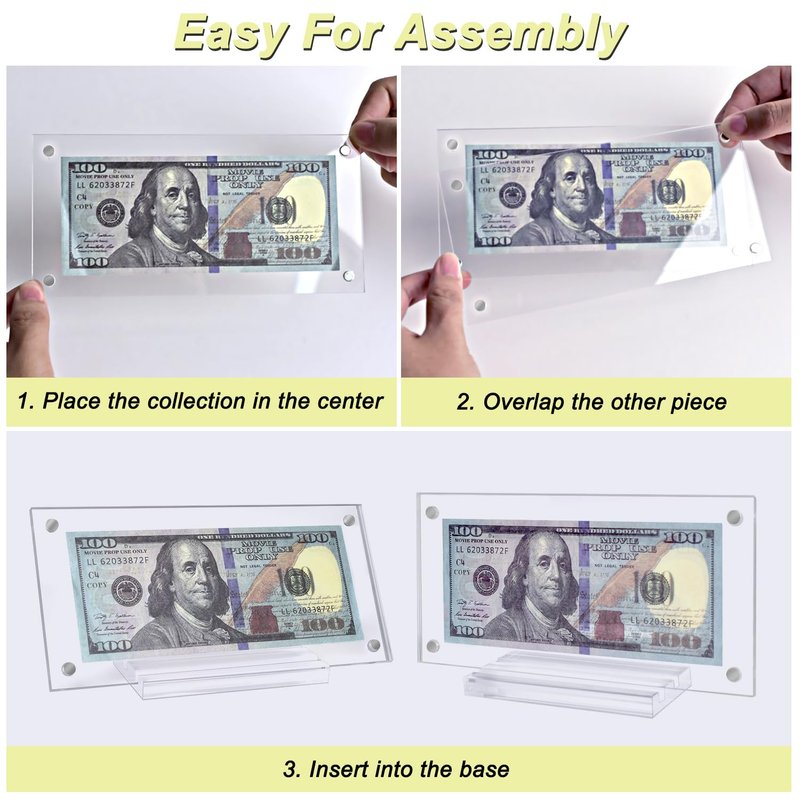 - Easy Installation: The Dollar bill display stand features a practical magnetic design that requires no tools. Simply align the panels, let the magnets do the rest, and insert the dollar frame into the base. This design allows you to quickly showcase your collection, saving you time and giving you more energy to enjoy your treasures