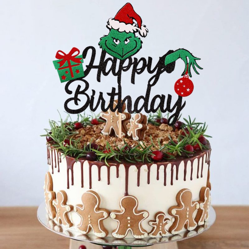 1 PCS Green Monster Happy Birthday Cake Topper Assembled Glitter Santa Hat Green Christmas Gifts Christmas Cake Pick for Merry Christmas Theme Baby Shower Kids Birthday Party Decorations Supplies