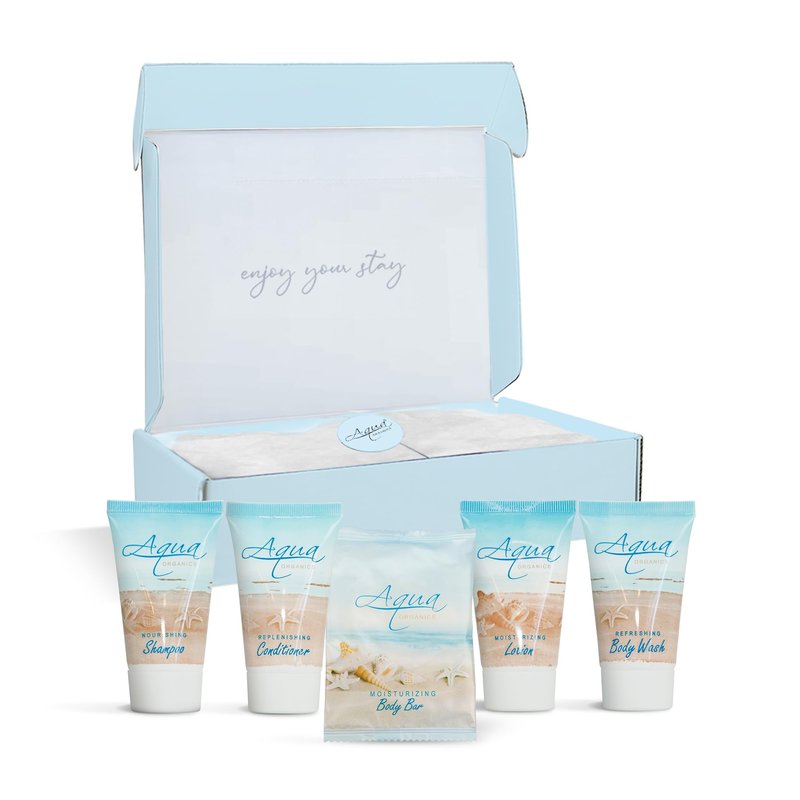 1-Shoppe All-In-Kit|Aqua Organics Amenity Kit|Boxed Hotel Toiletries|Bulk Set 1oz Travel Size Shampoo,Conditioner,Lotion,Body Wash & Bar Soap for Guest Hospitality AirBnB/Vacation Rentals|5 Pieces