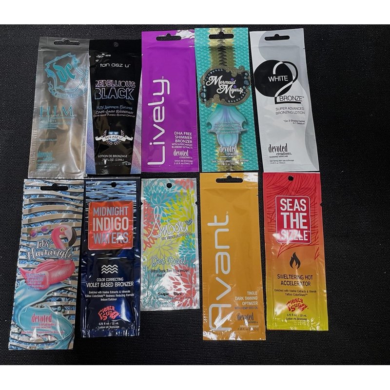 10 Assorted Tanning Bed Packets with some Tingle This 10 pack will possibly include Devoted Creations, Ed Hardy, Supre, Snooki, Hempz, ProTan, Fiesta Sun,Tan Asz U