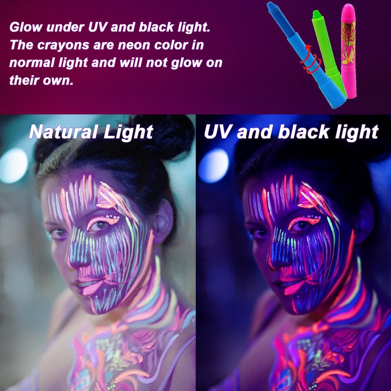 - * NIGHT LIGHT EFFECT: The glow in the dark face paint crayons apply to face and body and glow under UV and black light. The crayons are neon color in normal light and will not glow on their own.