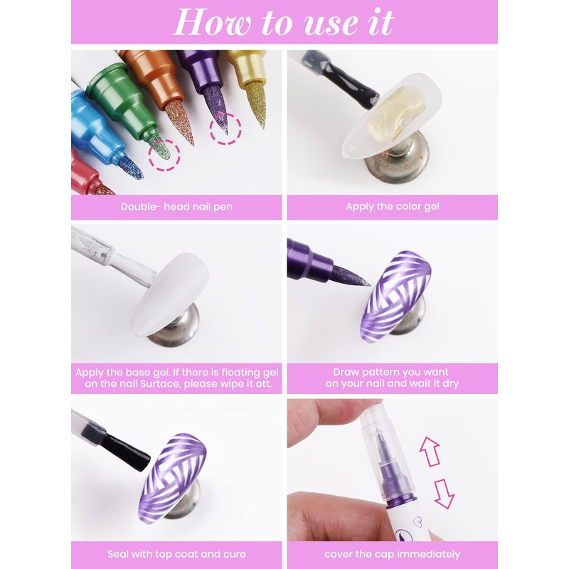 - 【NOTE】 - The nail art pens to be used with nail polish top coat, even if the drawing is wrong, just wipe it with alcohol. Until the drawing is completed, the nail polish top coat can be applied to the picture after air-drying. Need to cover the cap after use to prevent the pen from drying out.