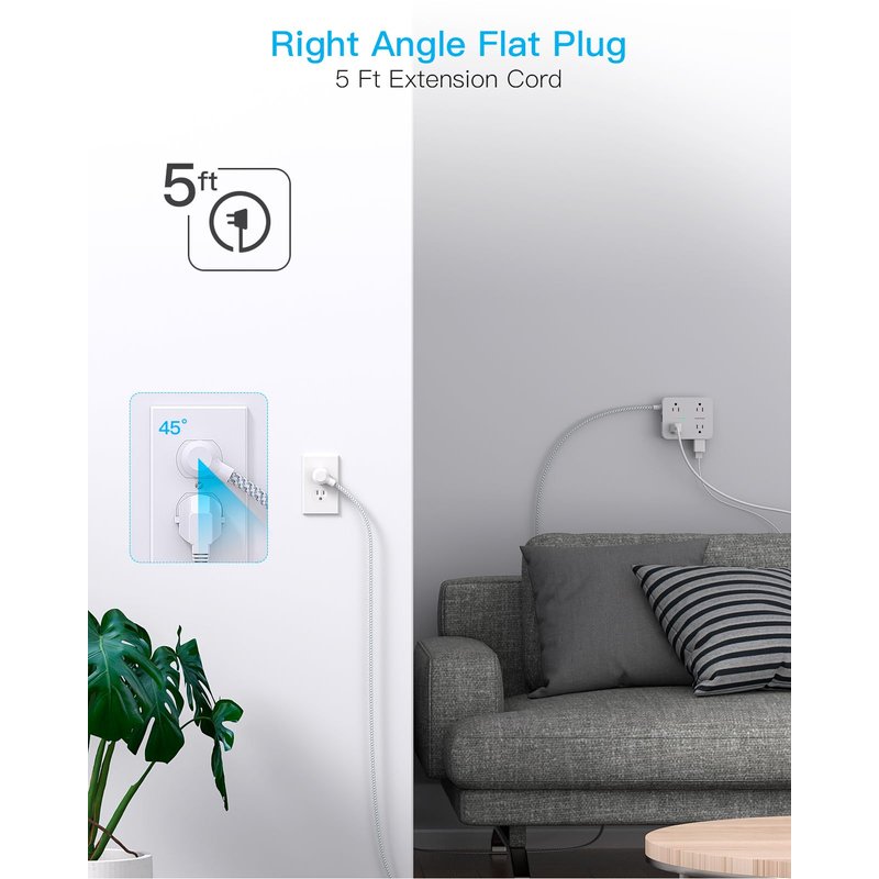 - 【Wall Mountable 10Ft Extension Cord with Flat Plug】- The low-profile flat plug fits easily in tight spaces; and the right angle flat plug design prevents bottom plug blocking; the 10ft upgraded power cord is very thick and has better current carrying capacity; the two mounting holes on back allows this power strip to be securely installed in various applications.
