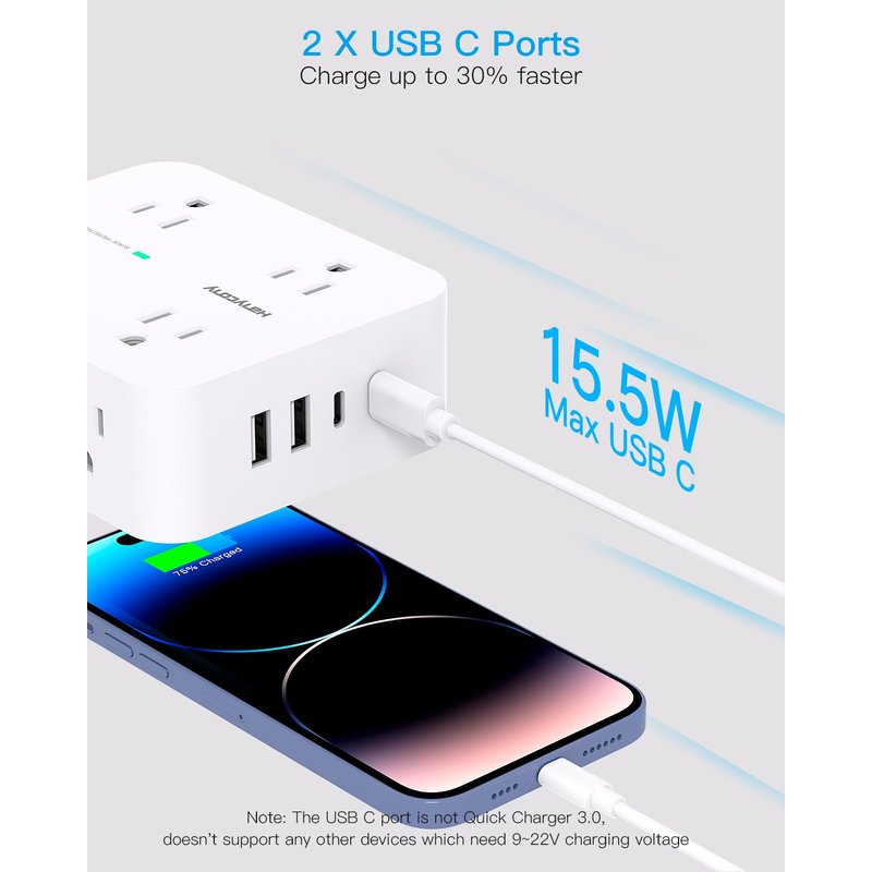 - 【2 x USB C Power Strip】- Added extra 2 USB C ports for your devices, the USB C port can charge up to 5V/3A. USB-A ports can charge up to 5V/2.4A Max, all USB Ports Output is 5V/3.1A, 15.5W max which is 30% faster than other usb c charging station. With smart charging technology, it can auto-detects your devices and can reach faster charging efficiency, perfectly fit for your iphone, ipad, tablet etc