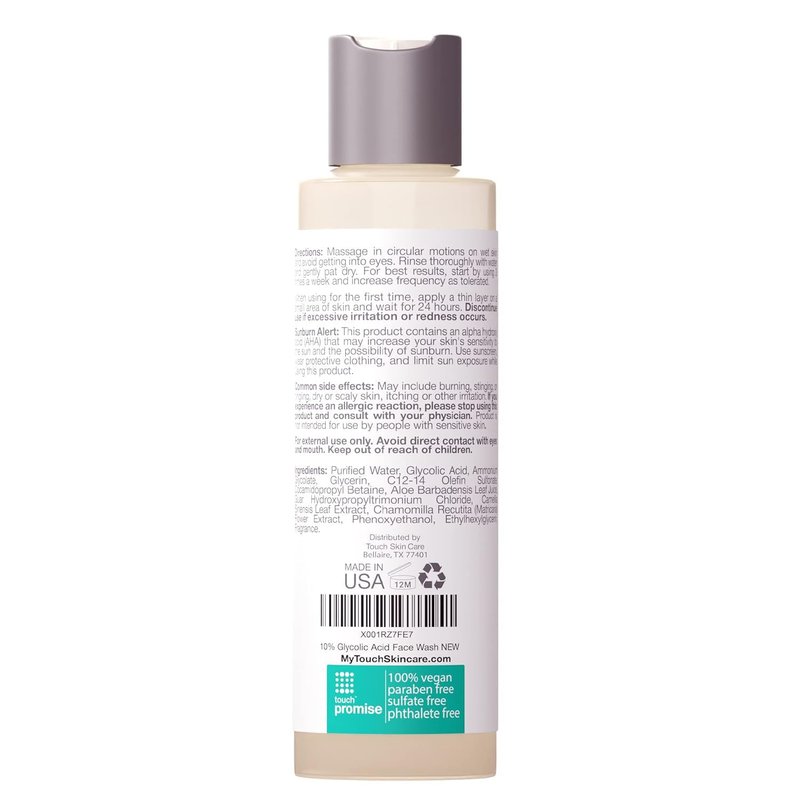 Touch 10% Glycolic Acid Face Wash - Exfoliating, Non Drying & Foaming AHA Cleanser - Perfect for Age defying, Skin Tone & Texture, Wrinkles, Pores, Blackheads - Sulfate Free, Oil Free, Low PH. An Exfoliating AHA Face Cleansing Treatment. GLYCOLIC EXFOLIATION FOR CLEAR SKIN: A foaming and sulfate free exfoliating facial cleanser made with 10% glycolic acid to exfoliate, brighten, & revitalize your skin without dryness. Our mild yet effective gel cleanser removes makeup with ease & works great with just your hands or Clarisonic brushes. POWERFUL ALPHA HYDROXY ACID (AHA): Our glycolic acid face wash has a low pH of 3.5 which helps fight the effects of aging, reduces blemishes, and promotes healthy glowing skin all without any irritation. Best cleanser for fine wrinkles, pores, uneven skin tone & texture, blackheads, & hyperpigmentation. NON DRYING & NO BREAKOUTS: A blend of gentle surfactants and humectants gives your skin a deep cleanse with no dryness. This age defying exfoliating face wash is suitable for all skin types including normal, oily, rough, dry, or combination. Can be used as a daily cleanser or just occasionally for an exfoliating kick. A pH below 3.5 can speed up the exfoliation process by almost 100%. Acids need to be in their "free acid" form to be effective and the lower the pH, the more "free acid" is available to work on your skin. This unique combination of glycolic acid and low pH is the secret to smooth, clear, natural looking skin. PLANT BASED INGREDIENTS: Aloe Vera, Green Tea & Chamomile combine to make your cleansing experience as pleasant as possible. Made in the USA in a cruelty-free facility. No parabens, dyes, phthalates, sulfates, or drying alcohols.