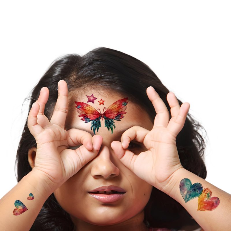 - COLORFUL BUTTERFLY AND GALAXY TATTOOS::-- This 10-pack of temporary tattoo stickers features vibrant designs of butterflies, feathers, and galaxy elements like stars and moons. These beautiful designs are perfect for cosplay, festivals, and Halloween parties for both adults and kids.
