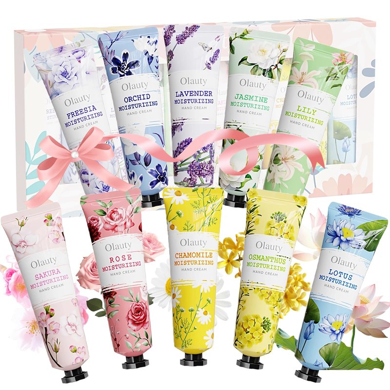 - 10 Pack Hand Cream Gifts: Hand cream, 10 different floral hand lotions, Freesia, Orchid, Lavender, Jasmine, Lily, Sakura, Rose, Chamomlle, Osmanthus, Lotus. You can choose different fragrances every day, and can also share hand lotion with friends and familys