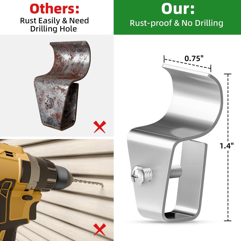 - 【Holds up to 18 lb per clip】- Siding clips for outdoor made of high quality polish thick 304 stainless steel max load bearing 18 lbs,stable and sturdy, will not deforme, rust or stain your siding,hooks for vinyl siding great for all seasons and long-lasting.