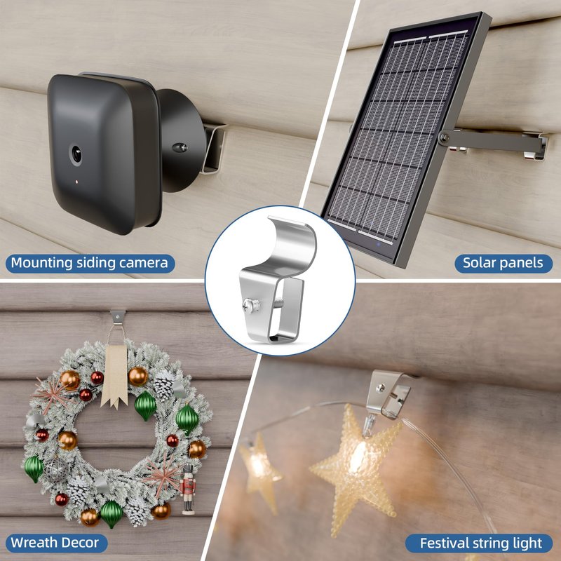 - 【Widely Applicable】These stainless steel siding mount clips are for housing outside cameras compatible with Blink, Arlo, ring, etc., and for hanging Christmas Wreaths, Outdoor String Lights, House Exterior Decorations, Plants, Solar Panel Lights, etc.
