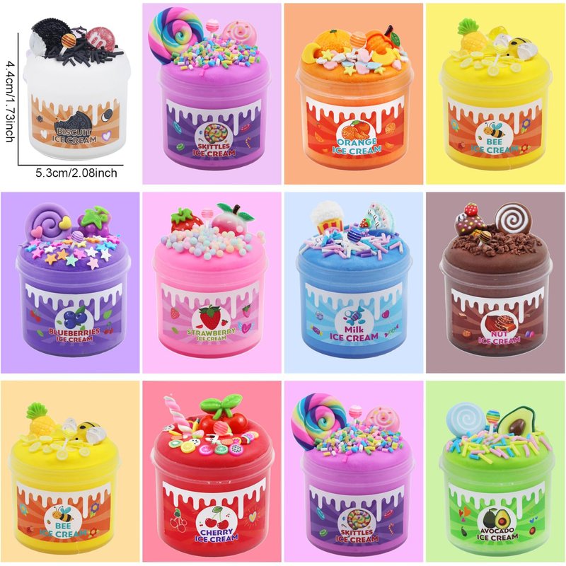 - [BUTTER SLIME KIT] Contains 10 premade slimes in different colors,pink,green,blue,yellow and so on,with 10 pack cute slime accessories,includes fruits,candies,stars and sprinkles.A variety of colors provide different sensory experiences,allowing children to feel the joy of creation.