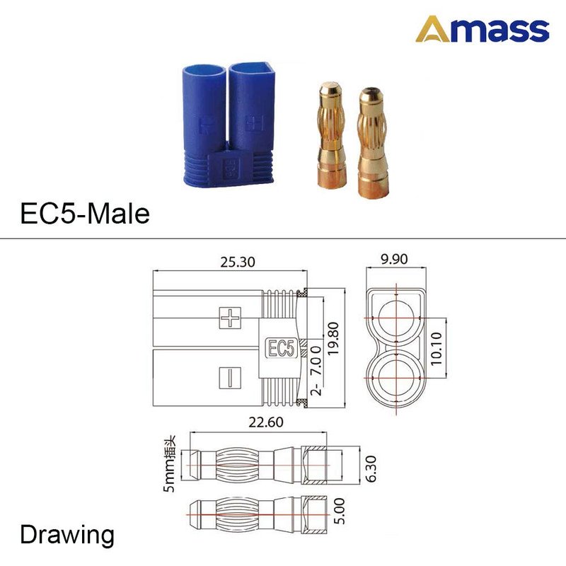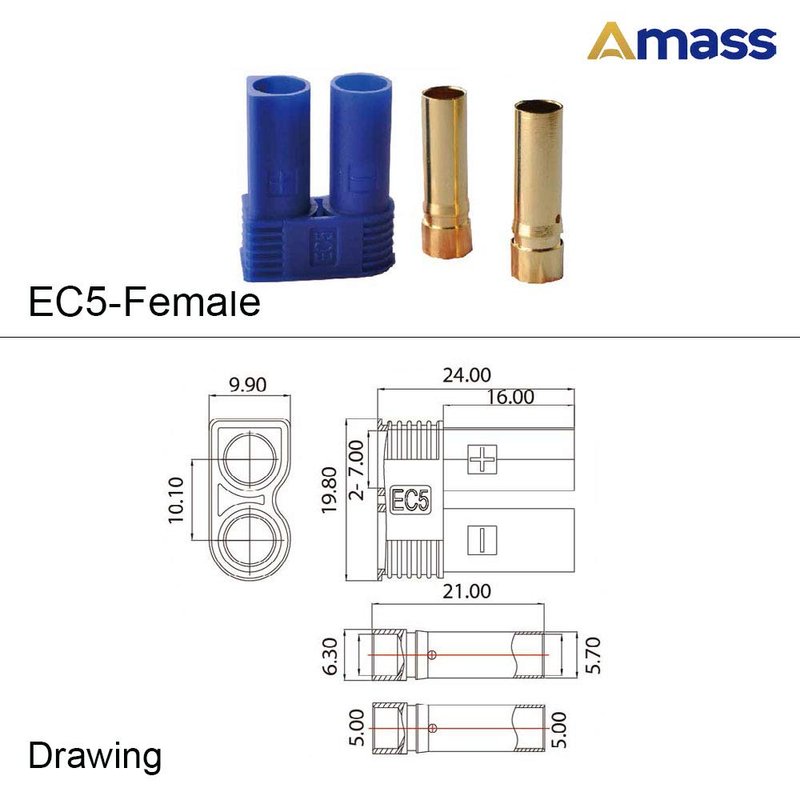 Description: Brand Name: Amass Model :AMASS EC5 5mm banana male and female connector Temperature Resistance: -20°C - 120°C Rated Current: 40A (EC5) Contact resistance: 0.4 mΩ (EC5) Recommend cable :10awg Use for :RC battery connector Package included: 10 x Male Connector + 10 x Female Connector
