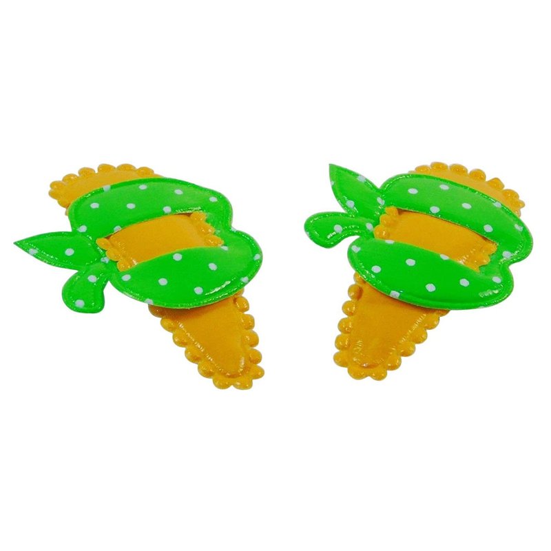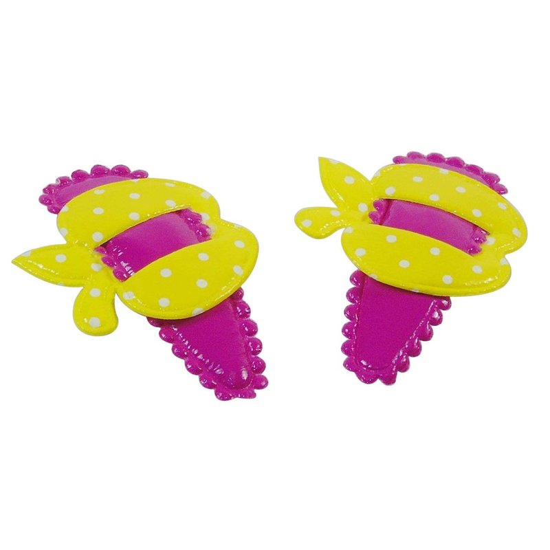 This collection of colorful hair barrettes will give your little girl plenty of selections to match just about any outfit. And, because girls will be girls, she'll get two identical pairs of each color scheme, just so she won't have to worry about not getting to wear her favorite color if she happens to lose one....or even two! Barrettes attach to the hair with a bend & snap style metal clip so they stay in place during her active day. These pretty barrettes come in five color combinations: red on blue, blue on pink, green on orange, yellow on red, and pink on green.