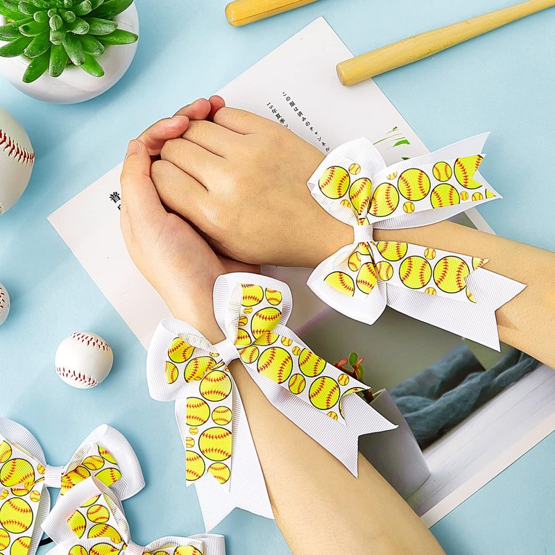 10 Pcs Baseball Softball Hair Bows Double Layers Bows with White Ribbon Sports Gifts for Girls Baseball Softball Accessories for Cheer Ponytail Holder Scrunchies for Girl Women(Yellow, Softball)
