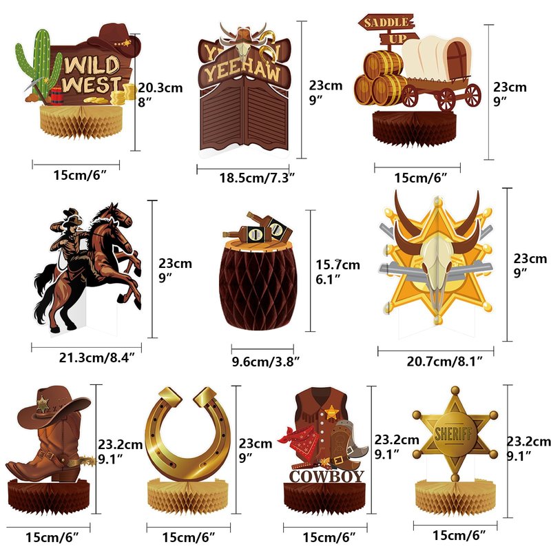 These are 9 pieces of western cowboy honeycomb centerpieces in different styles. Just finish the western cowboy table decor according to the picture in a few seconds.