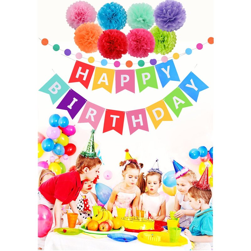 - ITEMS IN PACKAGE: When you receive the package, please make sure you get all the products as follows: 1*Happy Birthday Banner, 8* Tissue Pom Poms,6.5ft colorful Paper Garland Circle Dots