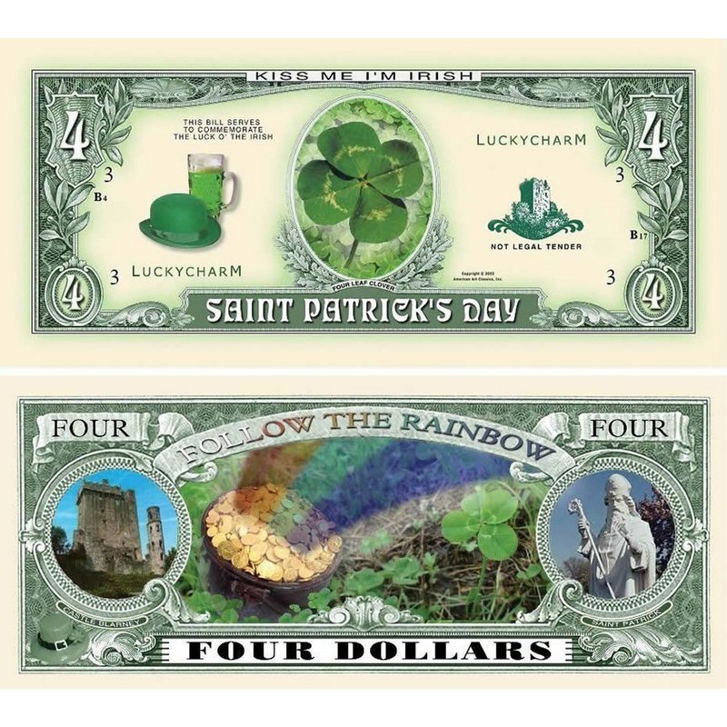 10 Saint Patrick Four Dollar Bill with Bonus “Thanks a Million” Gift Card Set