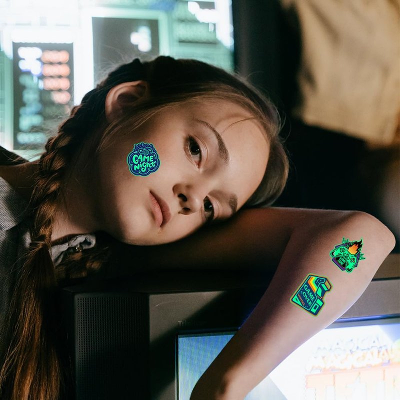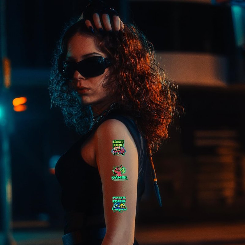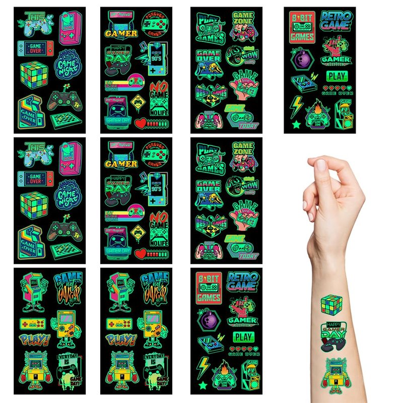 - Luminous design:These video game tattoos featuring with luminous effect, which will make you be unique at the party! Tips:Illuminating these tattoos a few minutes in advance under a lamp or sunlight will make the tattoos work better in the dark.