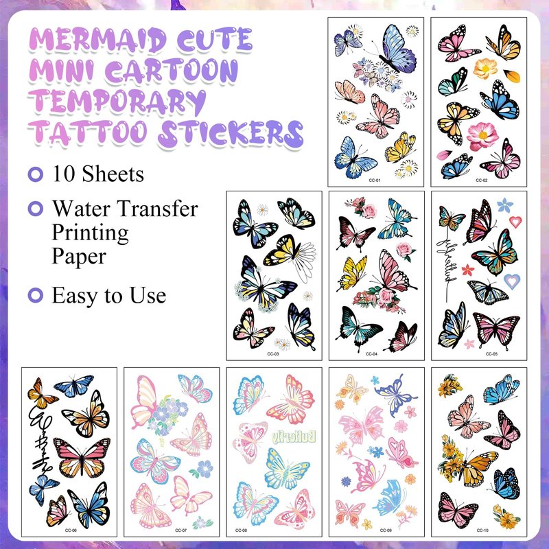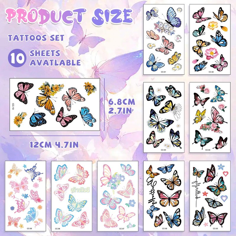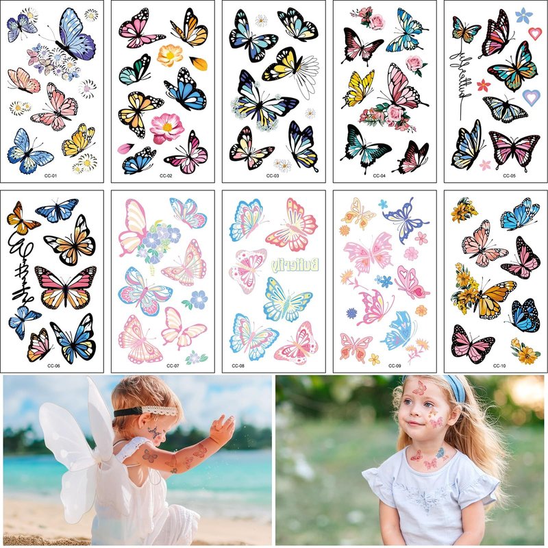10 Sheets Butterflies and Flowers Temporary Tattoos for Kids,Fake Tattoo Stickers for Women Girls Party Favors Supplies,Cute Waterproof Butterfly Cartoon Stickers