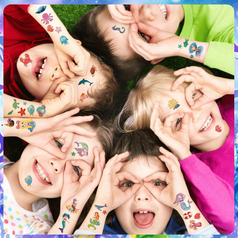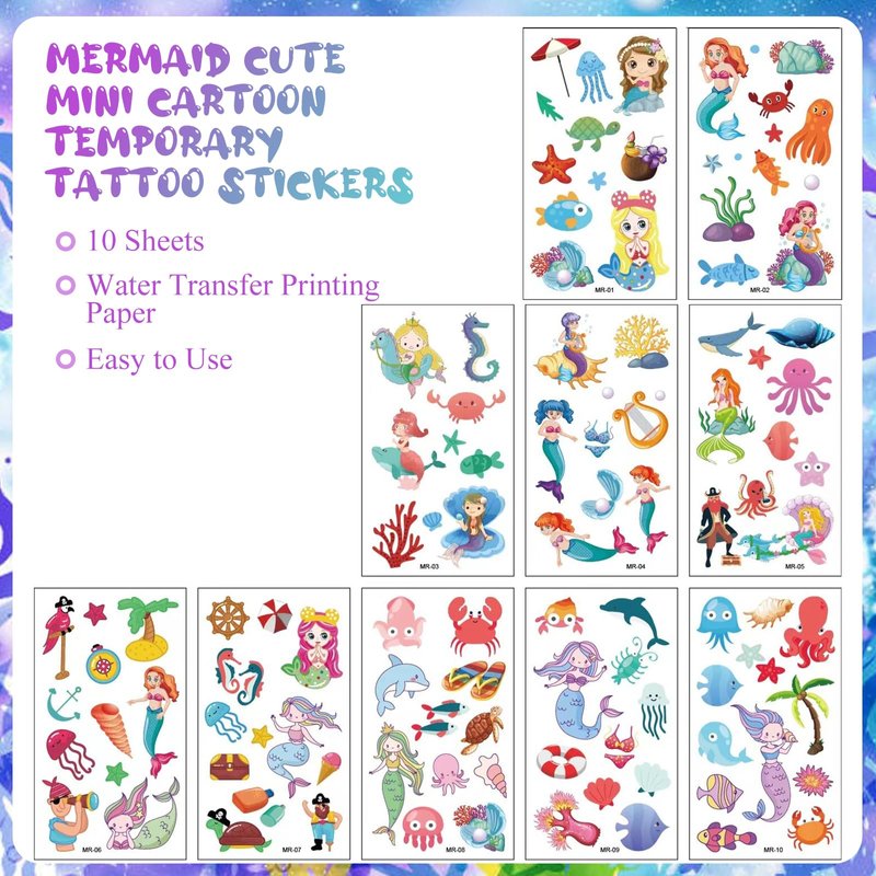 - Products Included : 10 sheets mermaid themed temporary tattoos in different designs. Each sheet measures 4.7in×2.7in(12cm×6.8cm).