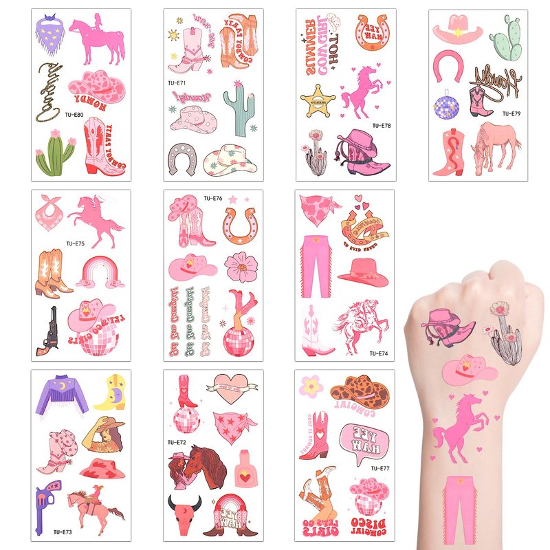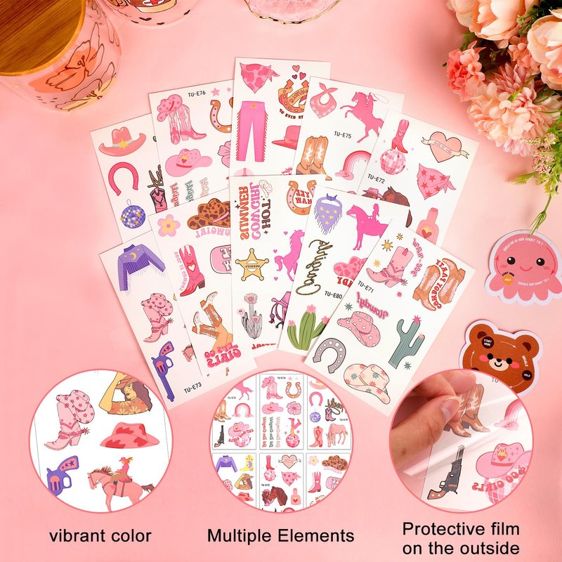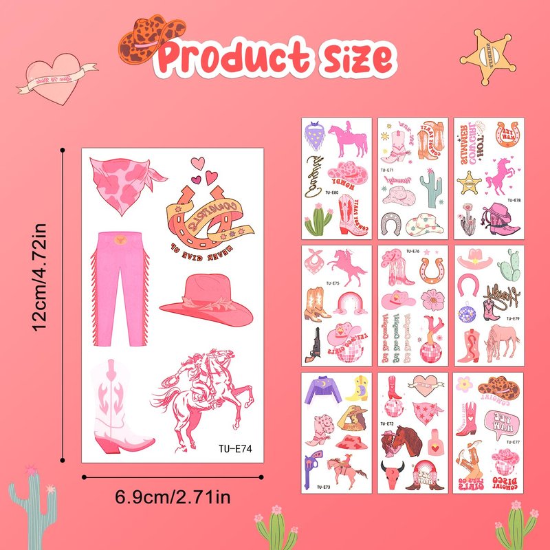 - Package Content: You will receive 10 sheets of pink cowgirl temporary tattoos, a total of 65 different patterns, each sheet size is 12x6.9cm/4.7x2.7in, sufficient quantity, and rich designs can meet your needs.