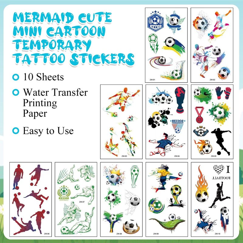 - Football Theme : This temporary tattoo sticker is themed around football and features graphics such as soccer balls, soccer players, medals, etc., exuding a sporty vibe.