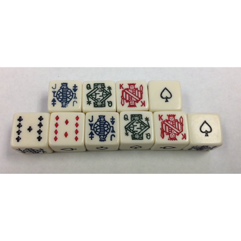 Poker dice are dice which, instead of having number pips, have representations of playing cards upon them. Poker dice have six sides, one each of an Ace, King, Queen, Jack, ten and nine, and are used to form a poker hand.