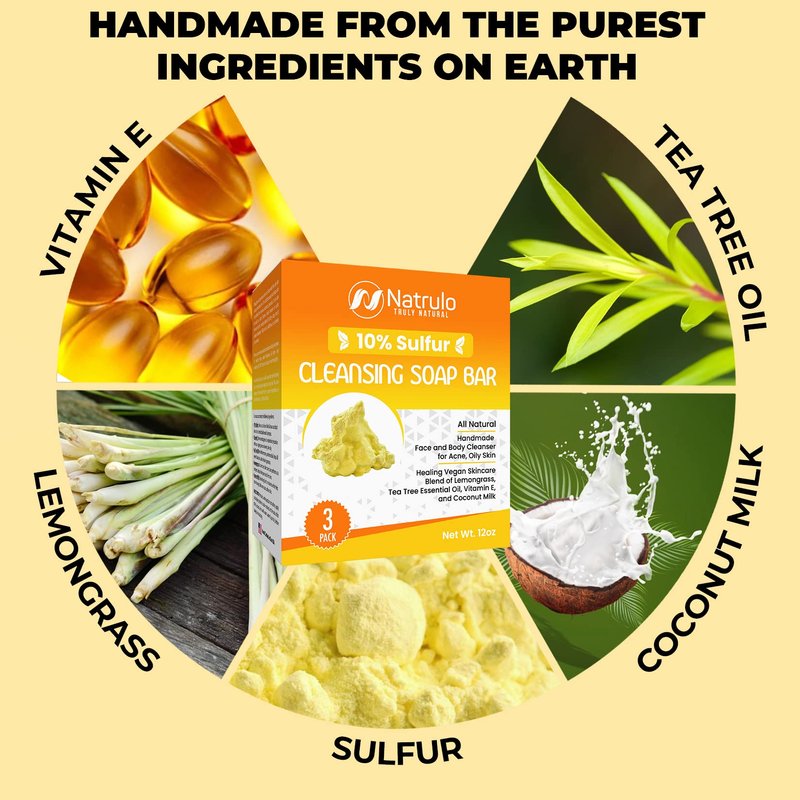- ALL NATURAL 10% SULFUR SOAP BAR: Enriched with 10% sulfur, our handmade bar soap can help relieve skin conditions, including acne breakouts & psoriasis. Sulfur is a natural ingredient found to be full of natural healing properties