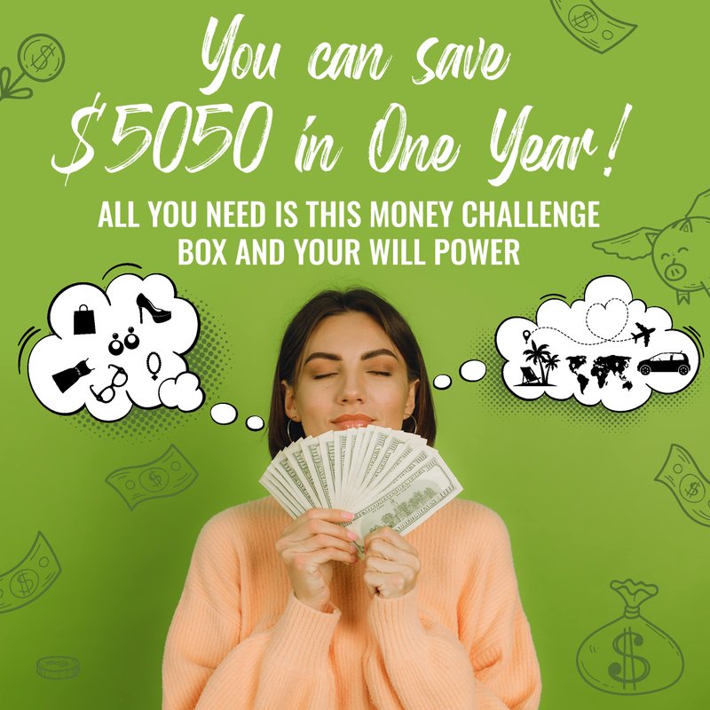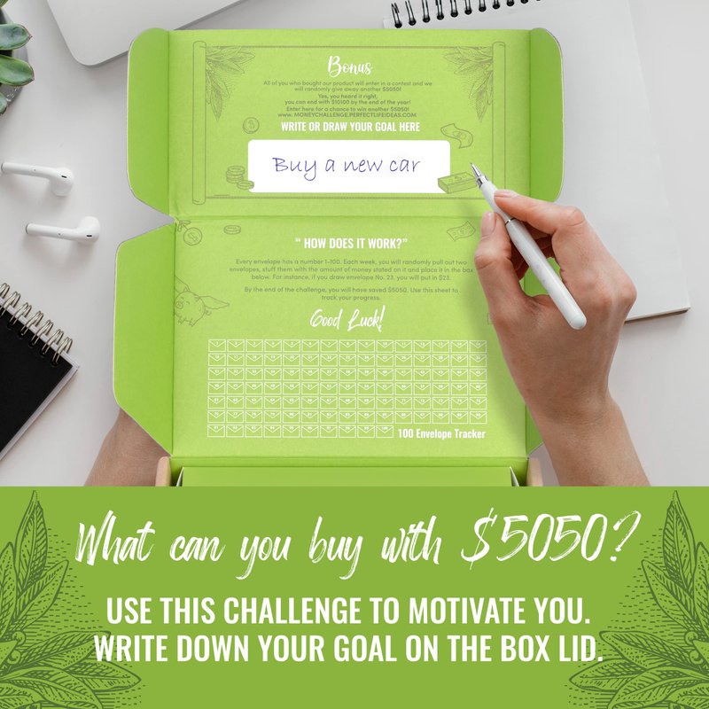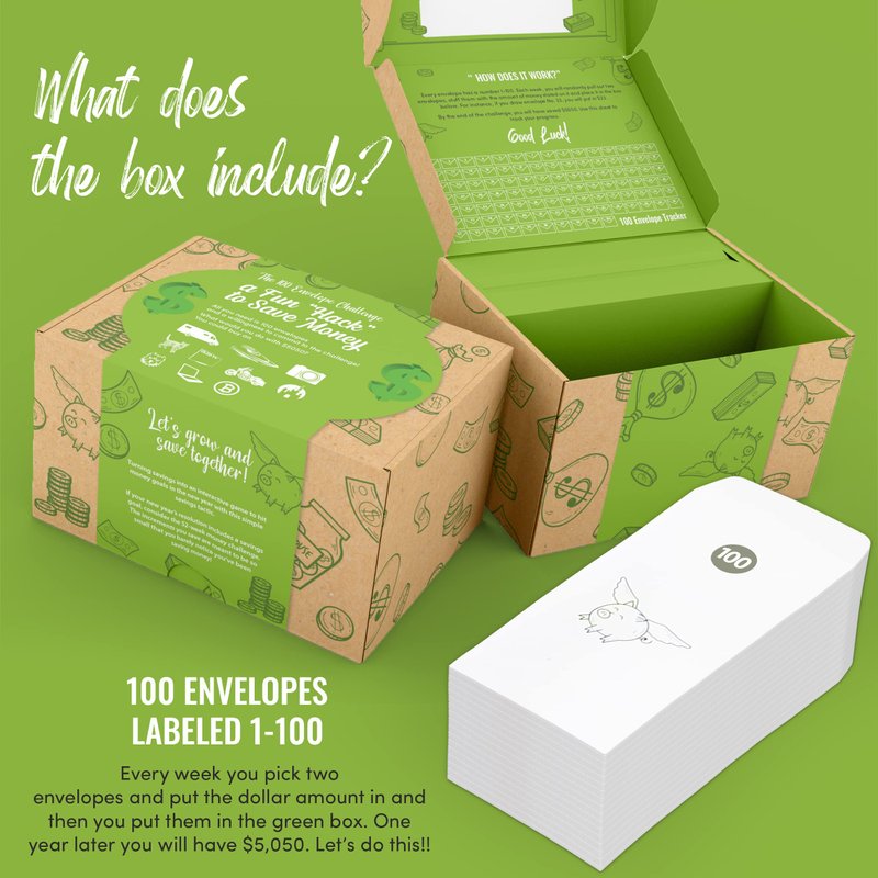 - 💌 HERE'S HOW IT WORKS. The cash savings challenge box includes 100 envelopes labeled 1-100. Every week you pick two random envelopes and put the dollar amount on the envelopes and keep them in the green box. One year later you will have $5,050. For multiples of $5050 you multiply the number by the multiple you want to set your goal. You can even do this s on a daily basis if you want to get to your goal sooner and in 100 days you will reach your goal in a great and fun way.