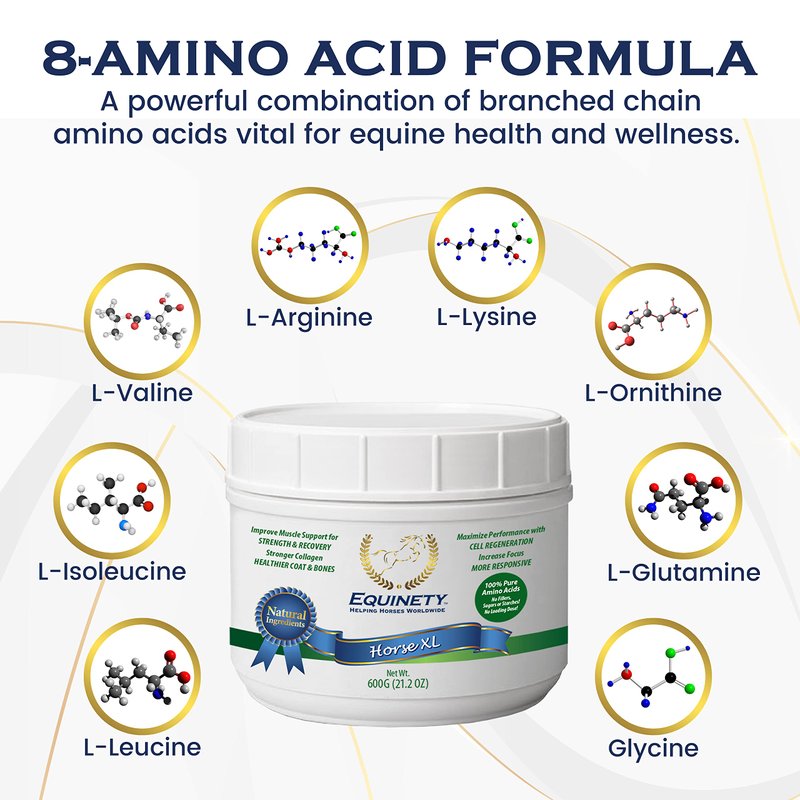 Complete Your Horse's Needs Equinety Horse XL is not like any other equine supplement with only 1 or 2 benefits. Normally, you will have to combine yourhorse's supplements with other equine maintenance products to complete your horse's nutritional needs. Good news: The 100% pure amino acid formula of Horse XL adapts to horses of any age or size - customizing its benefits according to your horse's nutritional needs. Horse XL works as a feed supplement, body builder for horses, provides essentialvitamins and minerals for sport horses, horse supplement weight gain or management, joint, hoof, and coat maintenance, aids in muscle and joint recovery, and more. One canister of Horse XL is equivalent to multiple products or horse supplementsaddressing different needs! No need to stack various equine supplements! Horse XL's 8-amino acid proprietary blend contains L-Arginine, L-Lysine, L-Ornithine, L-Glutamine, Glycine, L-Leucine, L-Isoleucine, and L-Valine. No artificial flavors, preservatives, fillers, sugars, starches, or any other ingredient that may be potentially harmful to your horse's wellbeing. That's why Equinety Horse XL's safe and natural formula requires no loading dose - just administer 1 scoop of Horse XL orally with or without horse feed. Product specifications: 1 canister = 600 grams Good for 100 days