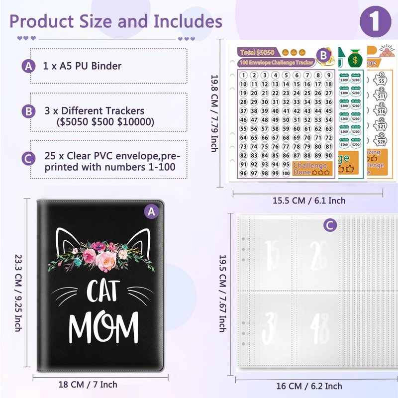100 Envelopes Money Saving Challenge Binder, A5 Budget Binder with 25 pcs Cash Envelopes, 3 pcs Reusable Laminated Trackers Saving $5050, $500, $10000, Money Organizer,Cat Mom Floral Design