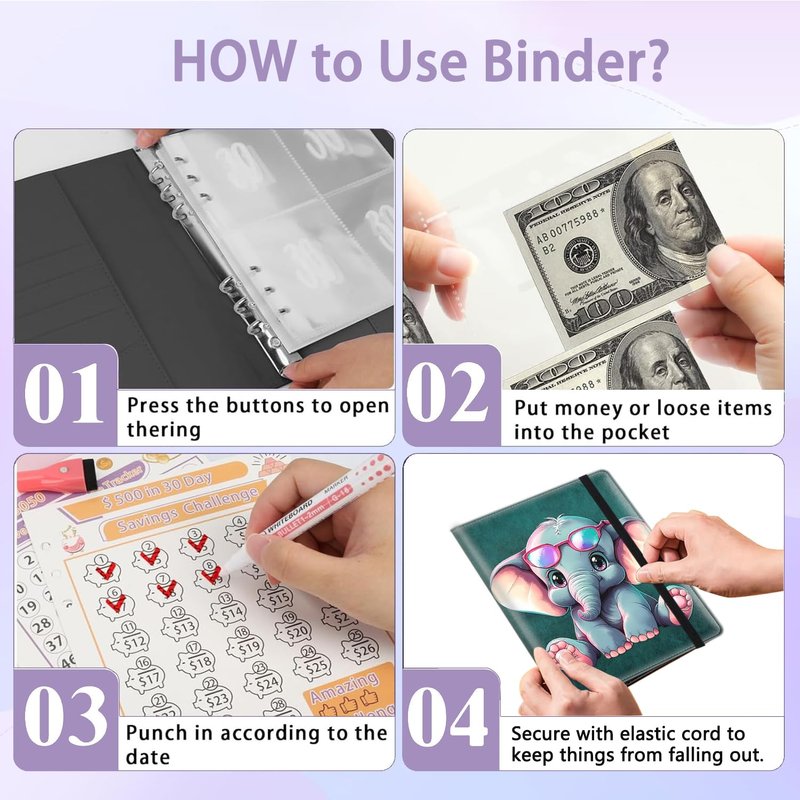 💰【100 Envelopes Challenge Kit】 1x PU leather savings challenges book with card slot, cash wallet, 3x laminated reusable savings tracker for marking - $5050, 10000, 500, 25x pages 6-hole cash envelope (4 pockets per page) with pre-printed 1-100 numbers, 2x PVC zipper bags, 1x Colorful Label Stickers, 20x Inspirational Quotes Stickers.💰【3 Reusable Laminated Tracker】 Easily keep track of your savings with this easy-to-use tracker.3 challenge options to choose from: 100-day, 30-day, and 52-week challenges to meet your varying needs for short- or long-term goals.3 challenges to choose from: 100-day, 30-day, and 52-week challenges to meet your varying needs for short- or long-term goals.💰【Easy Saving Process】 Once you have confirmed your target amount, starting on Day 1, deposit $1 in an envelope and mark the tracker with the number 1, and on Day 2 deposit $2 in an envelope and mark the tracker with the corresponding number ...... And so on, by the 100th day, you will have saved $5,050. Unlike the digital savings method, this is a tangible way to track your progress, and seeing the envelopes fill up over time will give you a greater sense of accomplishment!💰【Multifunctional Budget Binder】In addition to cash, this binder also holds business cards, credit cards, pens, bills, receipts and notes. The padded PU leather binder and premium PVC cash envelopes are waterproof, tear-proof and scratch-proof, protecting your belongings from water and dust.💰【Meaningful Gifts】 The 100 Day Money Saving Challenge is more than just a tool about saving money, it's also a great way to get your friends and family members involved in saving money, a great tool to teach your kids how to save money, and a great way to save money while having fun! If you encounter any quality problems, please feel free to contact us, we will provide you with a replacement or refund service to solve your problem properly!