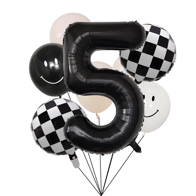 Package Includes: ✔ 40inch Black 5 Balloon ✔ 2pc 12" Black & White Smiley Face Latex Balloon ✔1pc 12" Flesh Latex Balloon ✔2pc 14" Checkered Balloon ✔ 1pc Ribbon to hang ✔ 1pc Straw to inflate