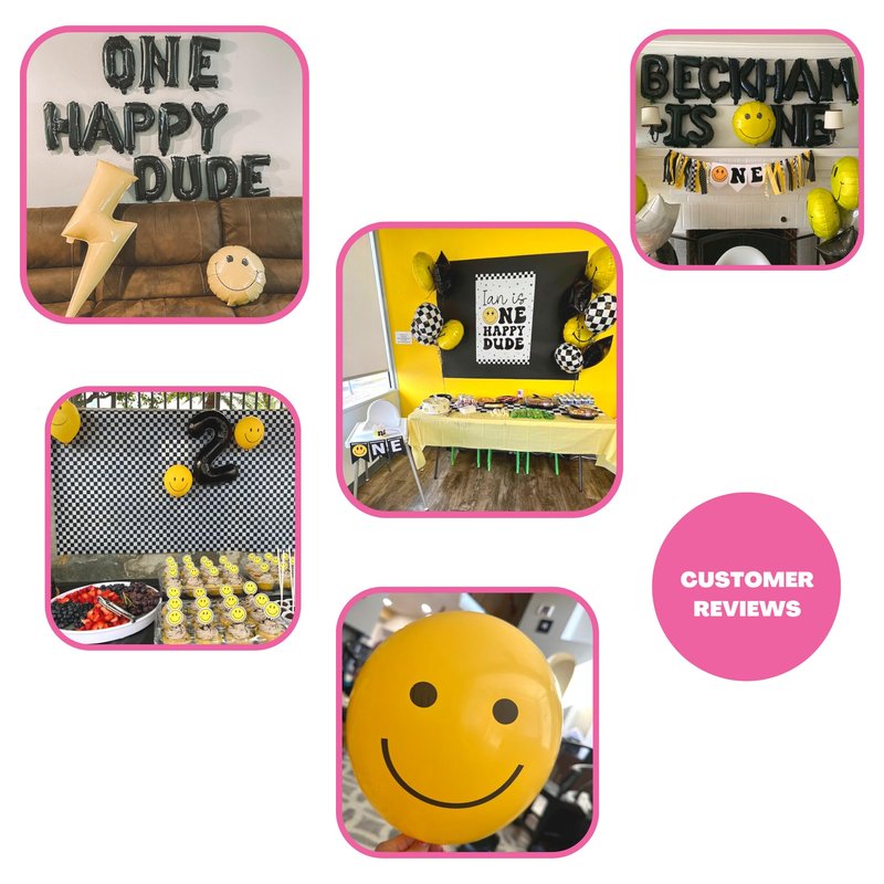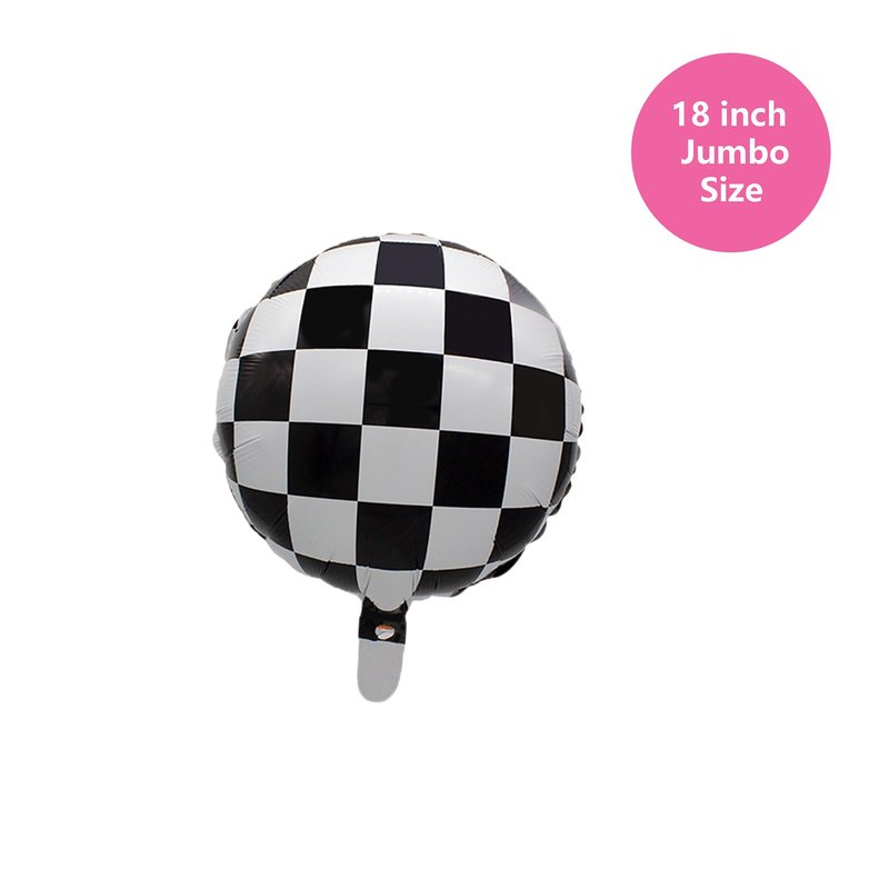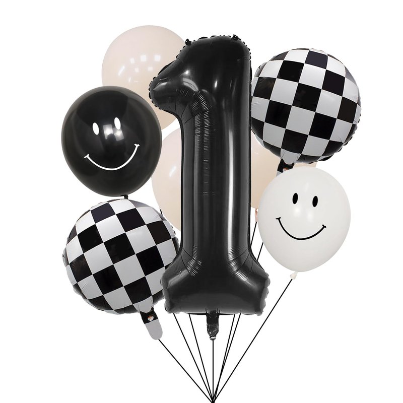 Package Includes: ✔ 40inch Black 1 Balloon ✔ 2pc 12" Black & White Smiley Face Latex Balloon ✔1pc 12" Flesh Latex Balloon ✔2pc 14" Checkered Balloon ✔ 1pc Ribbon to hang ✔ 1pc Straw to inflate