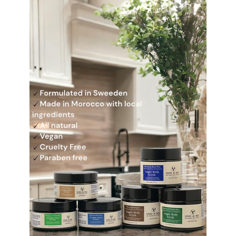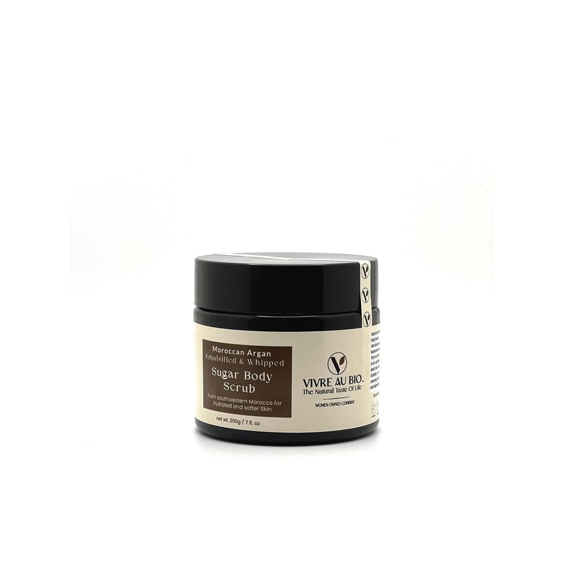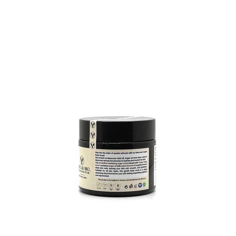 100% Natural Emulsified Sugar Body Scrub Infused with Moroccan Argan 200g. Formulated in Sweden & Made in Morocco with 100% Moroccan Sourced Ingredients. ISO & GMP Certified.