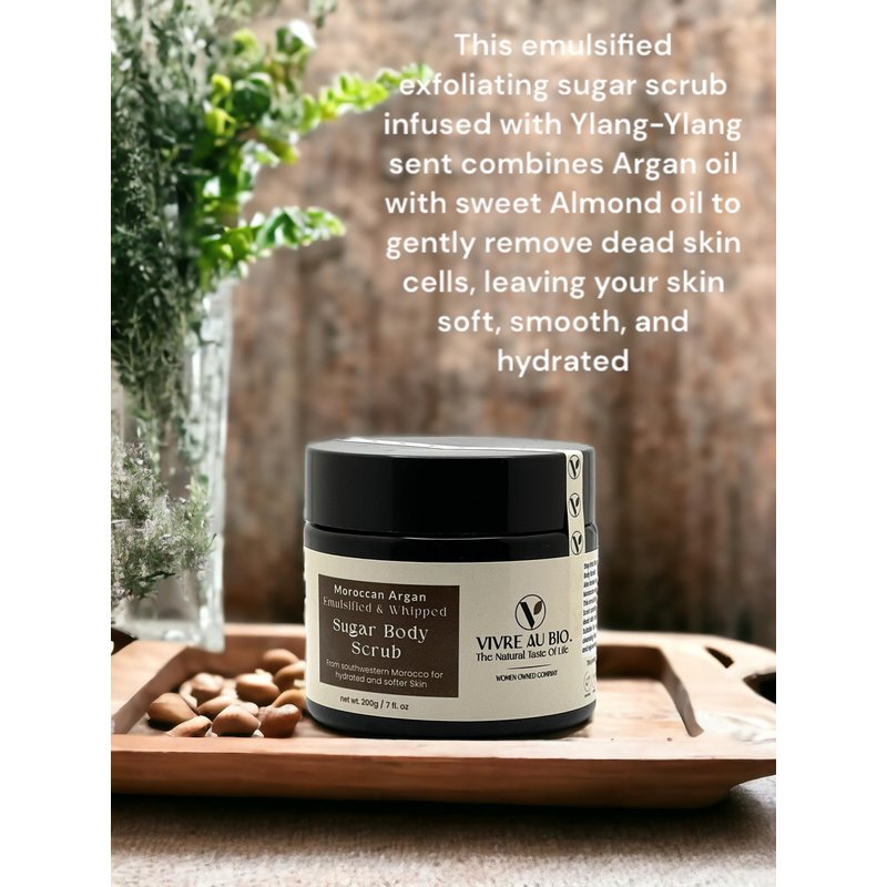 Step into the realm of opulent skincare with our Moroccan Emulsified Sugar Scrub infused by Argan Oil. Also known as Moroccan Gold Oil, this oil has been used by Moroccan women for centuries to hydrate and nourish the skin. This emulsified exfoliating sugar scrub infused with Ylang-Ylang sent combines argan oil with sweet Almond oil to gently remove dead skin cells, leaving your skin soft, smooth, and hydrated. Suitable for all skin types, this gentle body scrub is a deep cleansing ritual that leaves your skin feeling exquisitely polished and rejuvenated.