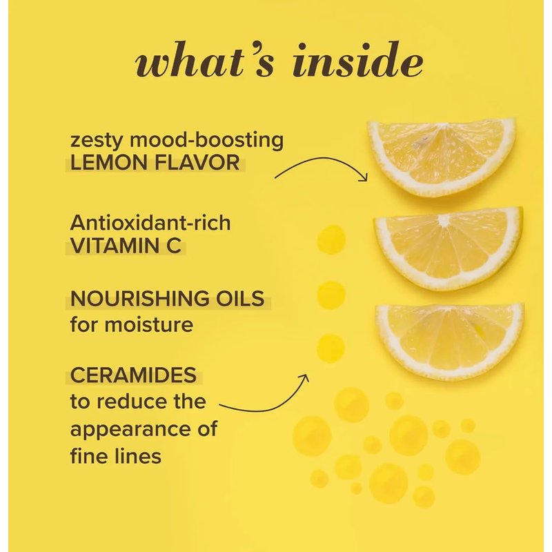 100% natural origin with responsibly sourced jojoba oil. For all. Formulated without parabens, phthalates, petrolatum or SLS. Experience an uplift with this zesty lemon lip treatment. Infused with antioxidant-rich Vitamin C. Nourishing ceramides and oils leave lips soft and smooth. BurtsBees.com/Values. Recyclable carton. Ingredients from nature. Leaping bunny certified. Responsible sourcing. Cruelty free. Made in USA of global ingredients.