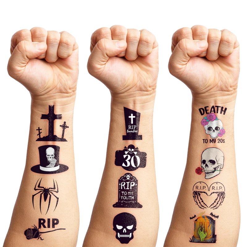 - 🖤 30TH THIRTIETH BIRTHDAY PARTY: Black Funeral Party themed temporary tattoos stickers, the tattoo with a spooky dark theme, features an humor funny elements, throw an exciting party for your dead 20th birthday and upcoming 30th birthday! MY DEATH TO 20 TATTOOS are perfect for themed parties, bringing you a unique, interesting, impressive birthday party, creating unforgettable memories.